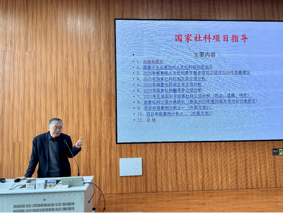 2026年3月19日,无锡太湖学院文法学院在6号楼122教室举办“国家社科基金项目申报策略与实战解析”专题讲座。本次讲座特邀浙江越秀外国语学院世界文学与区域国别研究院院长、苏州大学博士生导师朱新福教授主讲,学院骨干教师、青年学者及学生代表参会。
