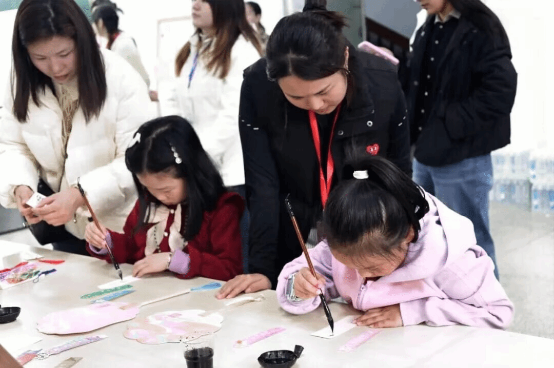 兰亭书画社团则带来非遗马勺脸谱绘与书签制作特色体验项目。社团成员向参与小朋友介绍马勺脸谱的民俗文化渊源与书画创作技巧,引导小朋友们运用笔墨、色彩进行马勺绘制,让传统民俗文化在创作中得以传承;书签制作环节融合书画艺术与创意设计,小朋友们精心勾勒、书写,制作出独具特色的艺术书签,在细微之处感受书画艺术的美感。
