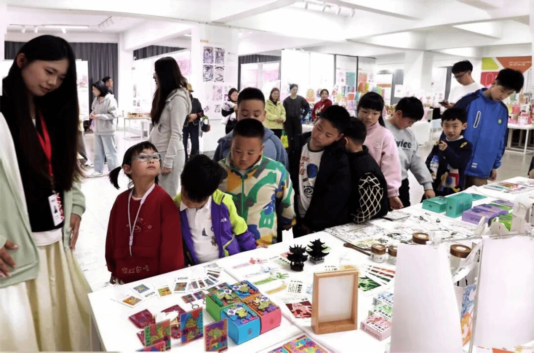 手工体验之余,参与活动的中小学生在工作人员的带领下,有序参观艺术学院优秀作品展。展览汇集了学院师生的各类创作成果,涵盖产品设计、服装服饰、视觉传达等多个艺术门类,作品主题丰富、形式多样。产品设计专业的飞机模型、送餐机器人前围满孩子,大家争相观察机器人移动;俯身细看环境设计模型,好奇地翻阅视觉传达文创并询问灵感。在服装设计专业的成衣与海报前,孩子们发出连连赞叹声。大家在展示厅穿梭互动,悄然埋下创意与审美的种子。