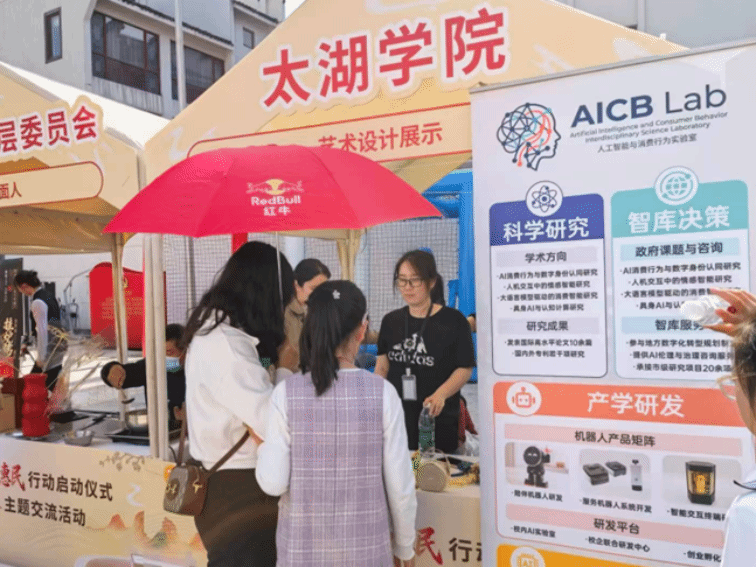 4月25日,无锡市统一战线“聚力惠民”行动启动仪式暨“聚力惠民·滨暖万家”主题交流活动在荣毅仁纪念馆前举行。市委常委、统战部部长马良,滨湖区区委副书记、区长吴虹娟,市委统战部常务副部长金卓青,区领导陈虎等出席活动。无锡太湖学院商学院师生团队受邀参加本次惠民市集活动,以“AI导购+文创展示”的形式服务锡城市民,展示了学校在人工智能应用、创新创业实践和应用型人才培养方面的积极成果。