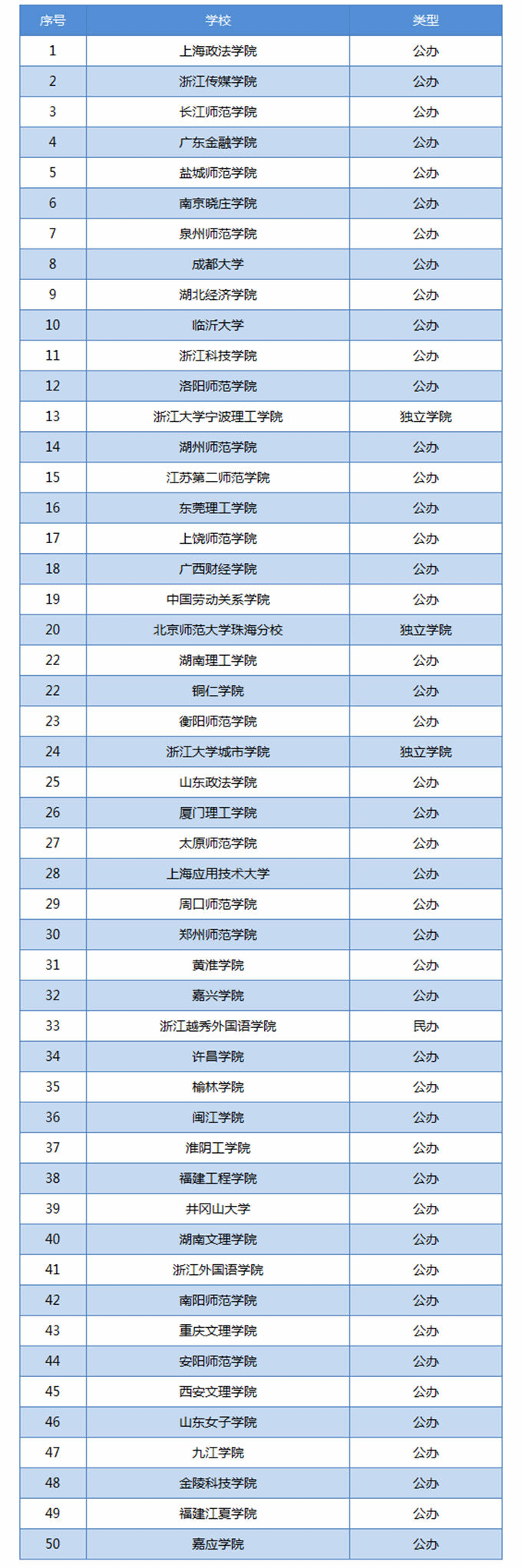 CSSCI期刊发文排行榜前50强中有46所公办高校和4所民办高校。4所民办高校分别是浙江大学宁波理工学院、北京师范大学珠海分校、浙江大学城市学院和浙江越秀外国语学院。进入100强的民办高校还包括宁波财经学院、浙江树人学院、湖南涉外经济学院、厦门大学嘉庚学院、电子科技大学中山学院等7所院校。