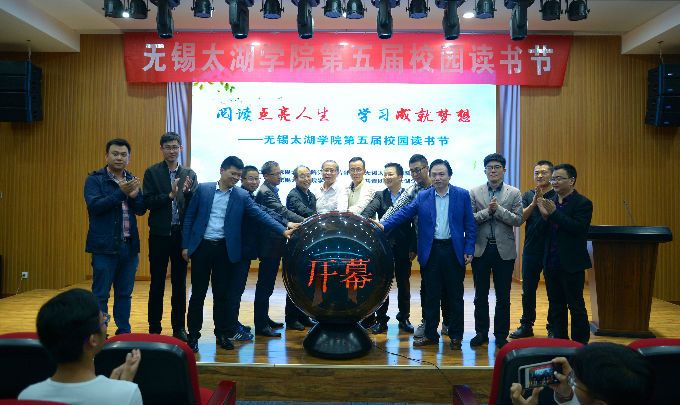 在与会人员热烈的掌声中,阙明坤部长宣布无锡太湖学院第五届校园读书节开幕。学校办公室主任朱中伟、学生工作处处长郑斌、团委副书记陈朕、图书馆副馆长刘文社、物联网工程学院院长惠晶、土木工程学院院长于安林、会计学院院长唐建荣、外国语学院院长包通法、物联网工程学院党总支副书记沈峰、机电工程学院党总支副书记杨学圣、土木工程学院党总支副书记余波、会计学院党总支副书记蒋昊霖、外国语学院党总支副书记俞昊波、艺术学院党总支副书记武蓓蓓、护理学院党总支副书记胡宇共同启动无锡太湖学院第五届校园读书节开幕仪式。